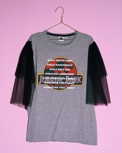 T-shirt po upcyclingu z koronkowymi rękawami roz. S/M